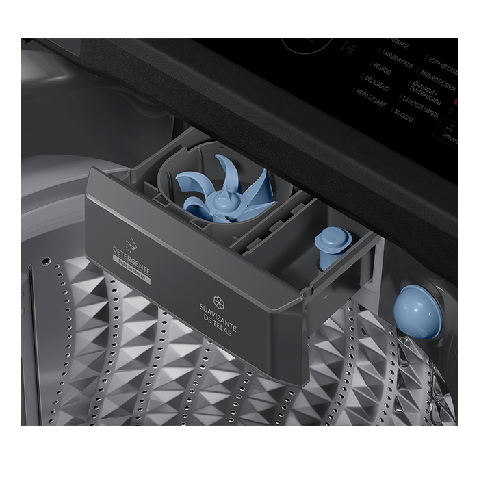 Una WA6000C en un lujoso espacio de color gris oscuro.Un fuerte chorro de agua, espuma y un motor con tecnología de inversor digital lavan una camisa azul. Bubblestorm™ forma abundantes burbujas para penetrar en el tejido 2.5 veces más rápido* y Dual Storm™ gira y frota los artículos para permitir una limpieza eficaz. Ecobubble™ impulsado por Digital Inverter, ahorra un 60 % de energía, un 14 % de agua y ofrece un 20 % de mejor cuidado de las telas.